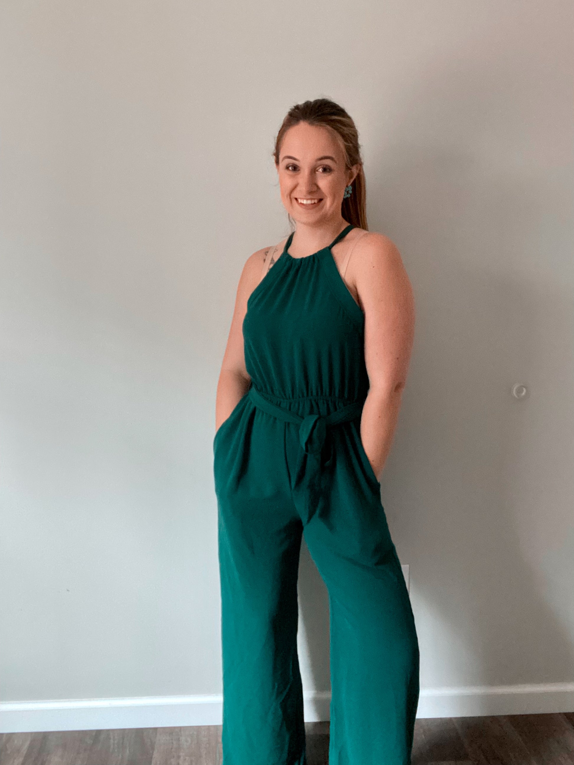 Green jumpsuit, true to size, elastic waist with a tie neck