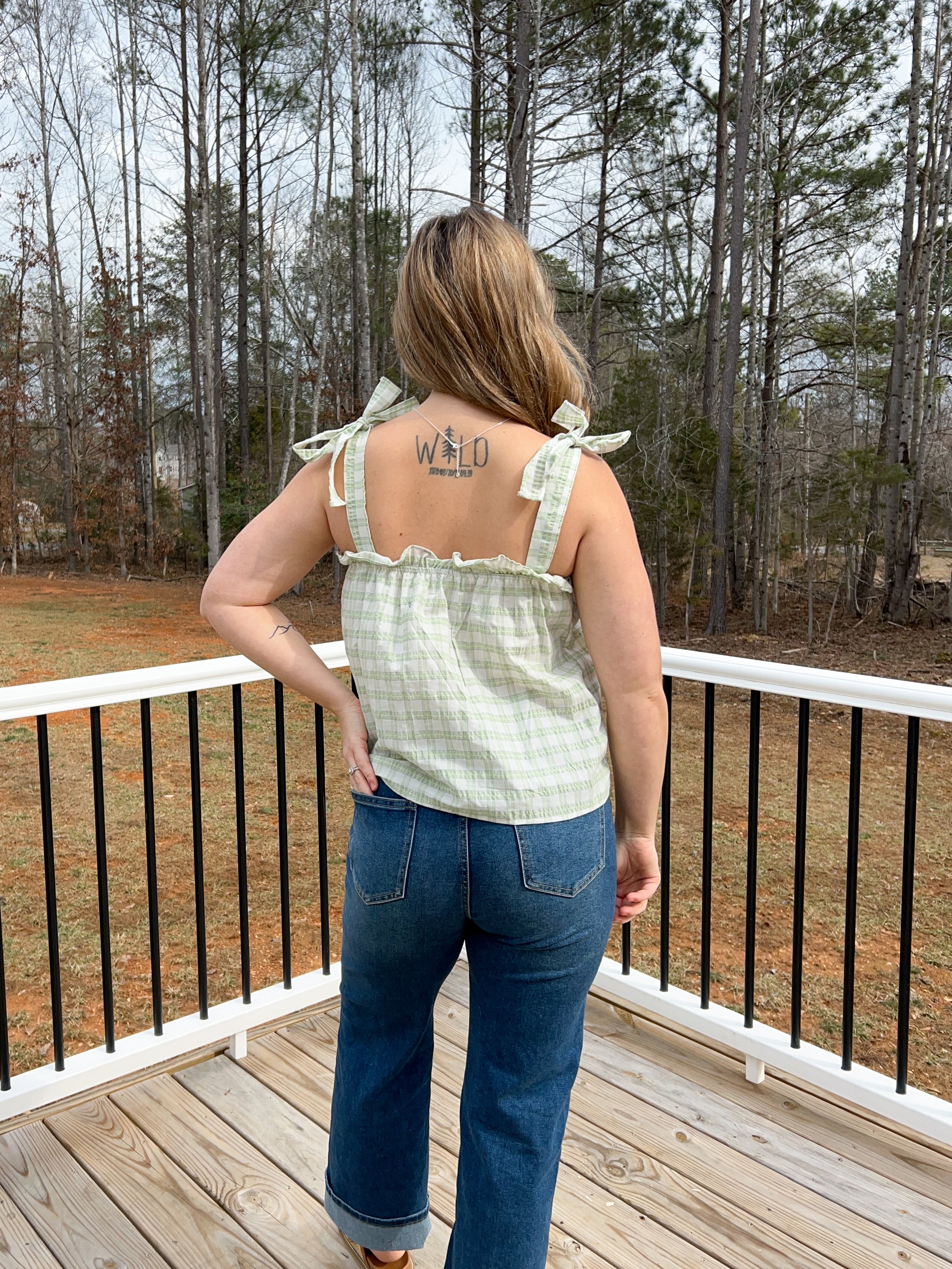 Gingham print, color mint, decorative bow on the shoulders, ruffle hem with elastic neckline